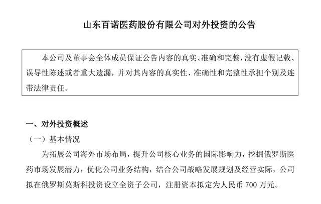 报告显示,为拓展公司海外市场布局,提升公司核心业务的国际影响力,挖掘俄罗斯医药市场发展潜力,优化公司业务结构,结合公司战略发展规划及经营实际,百诺医药拟在俄罗斯莫斯科投资设立全资子公司,注册资本拟定为人民币700万元。企业注册地址在俄罗斯莫斯科,主营业务为药物研究与开发、药品技术转让及技术咨询、药品生产及销售、货物与技术进出口。